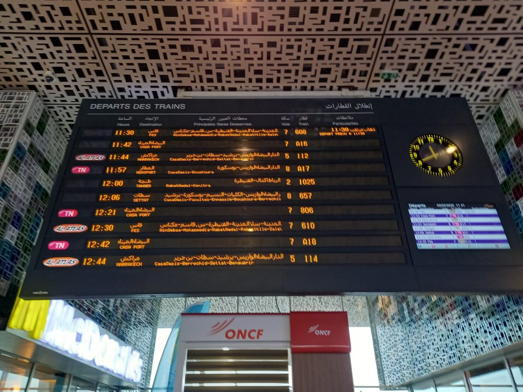 出発案内板があったのでぱしゃり!この駅からはフェズ、マラケシュ、タンジェなど各方面への列車が発着しています。