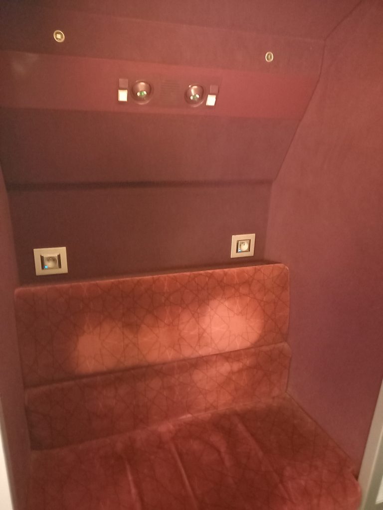 小さなラウンジスペースでしょうか?座席番号が割り当てられていないように見えるのでここに座る特急券は発売されていないようですが、コンセントや読書灯まで完備された豪華なラウンジスペースです。